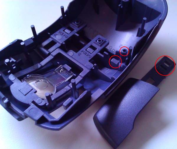 #2 removing a stem from inside the rev2 metallic left click button the top metallic left click button has an extra stem which gets in the way of the rev1 rubber siding. You have to use a fine pair of pliers to snip the excess plastic out, shown here: